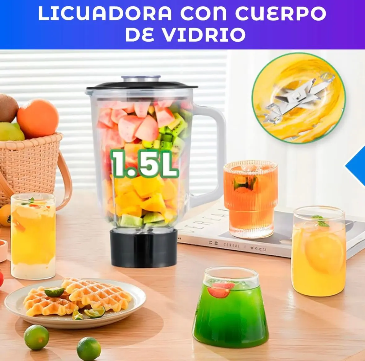 Esta batidora no solo ahorra espacio, sino que también multiplica tus opciones en la cocina: la función de licuadora permite preparar jugos, smoothies y sopas en segundos; mientras que el accesorio picador es ideal para vegetales, carnes, quesos o frutos secos.