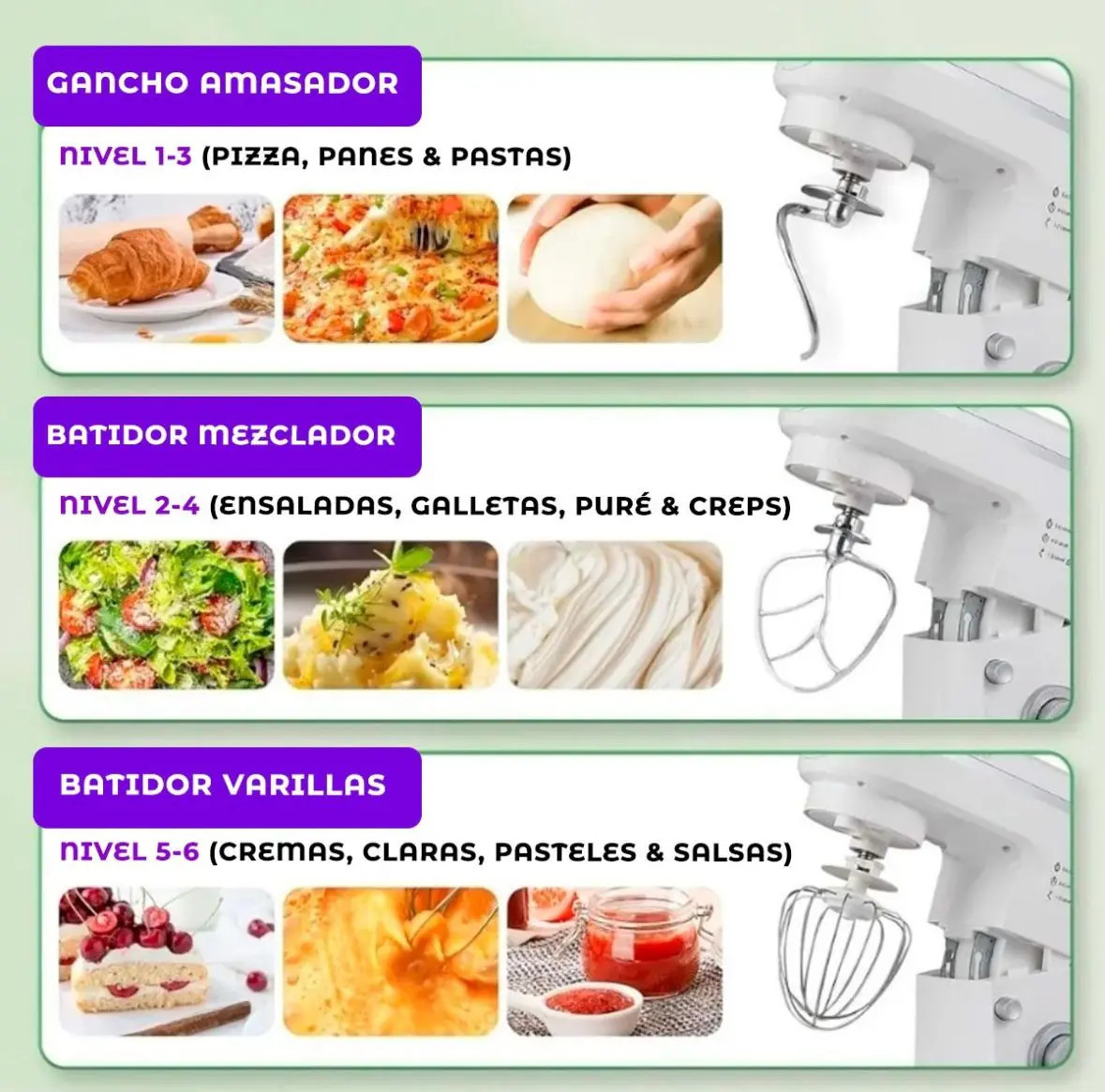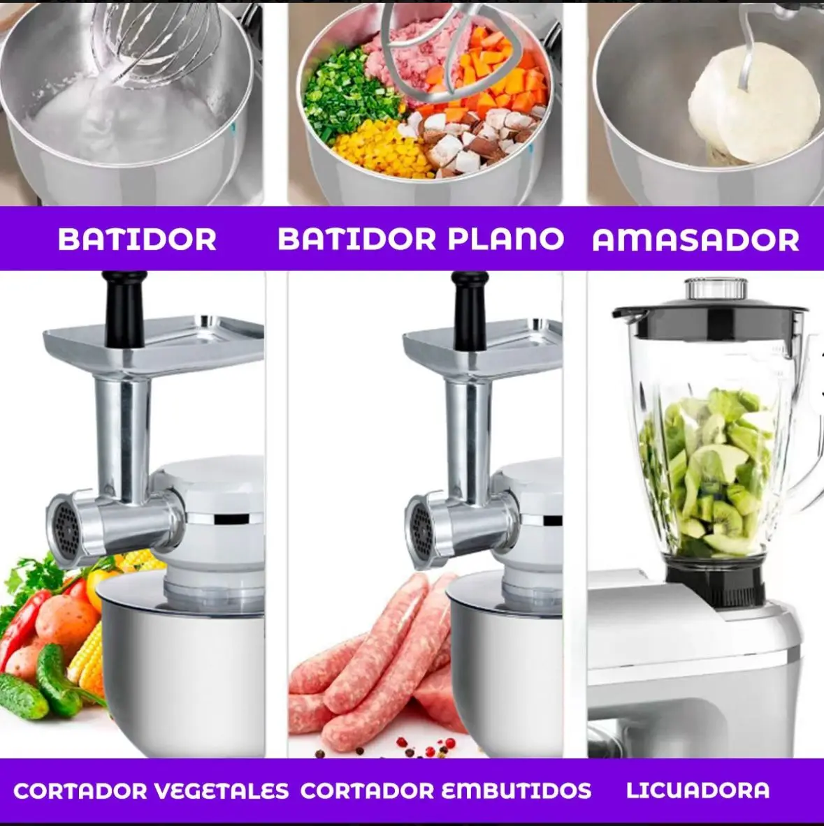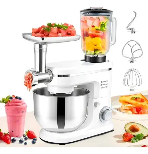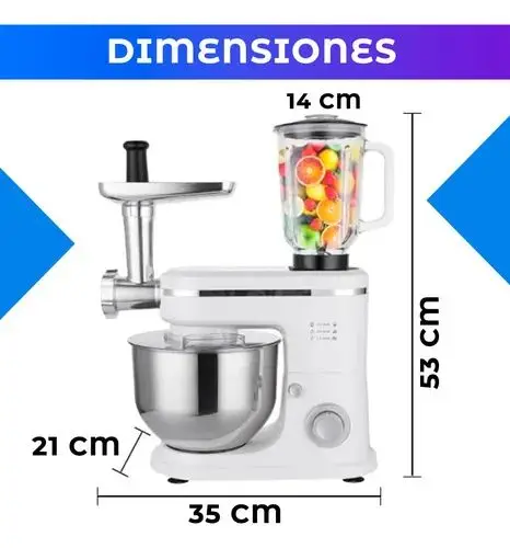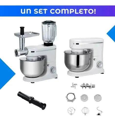 Incluye:1 Batidora eléctrica base, 1 Bowl de acero inoxidable de 5 Distintos cabezales de la picadora, 1 Vaso licuadora de 1.5, 1 Gancho para amasar, 1 Batidor mezclador,1 Batidor de varillas y 1 Manual de usuario